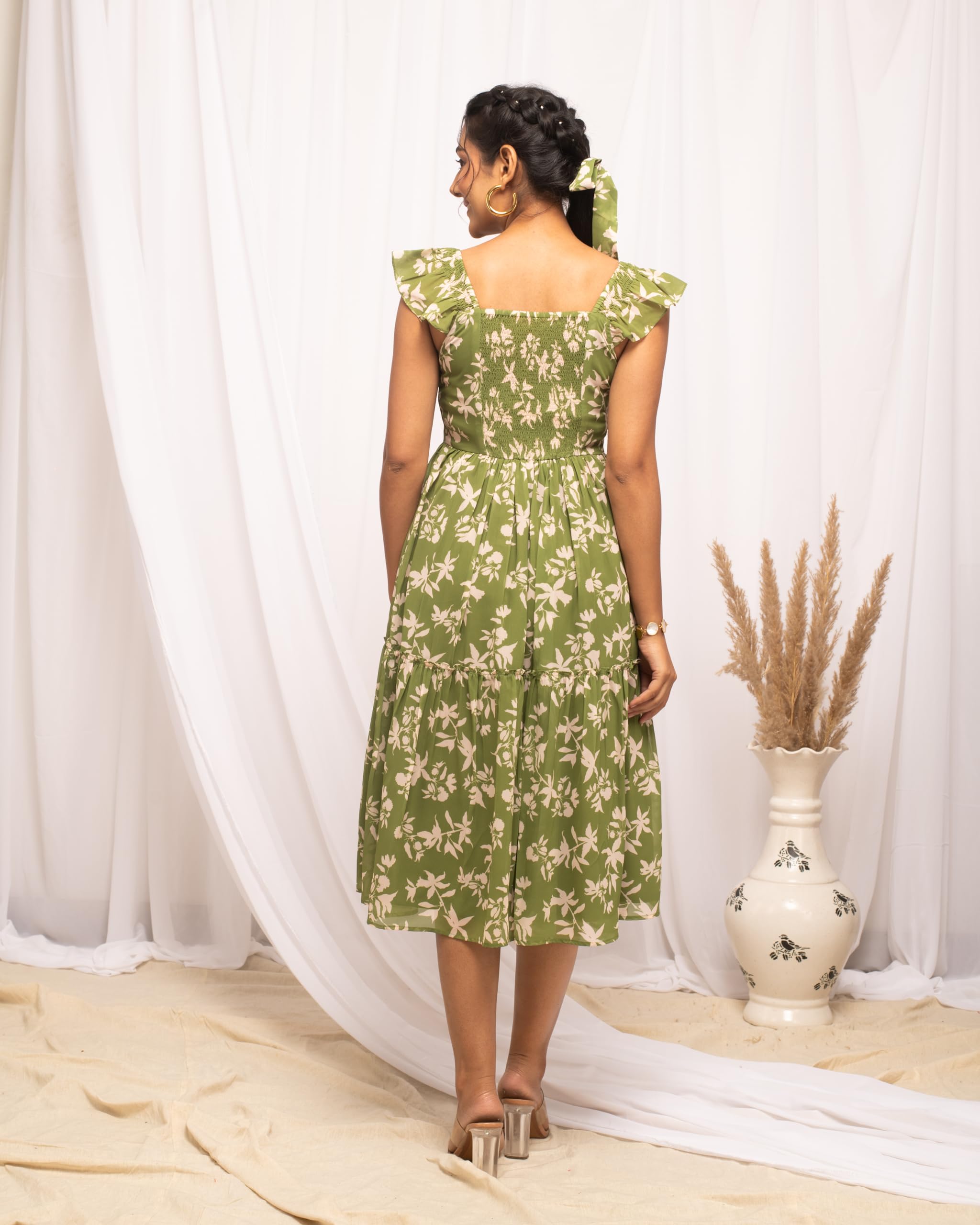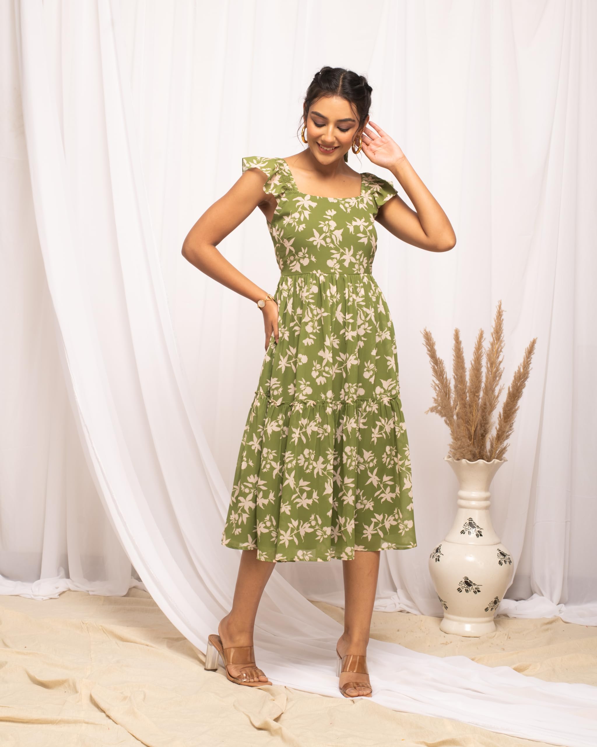 The mehandi green shade, paired with intricate floral prints, adds a refreshing vibe. Whether you’re heading to a daytime event, brunch with friends, or a family get-together, this dress fits right in. Additionally, the flared cut gives it a playful swing, allowing ease of movement and a touch of sophistication.