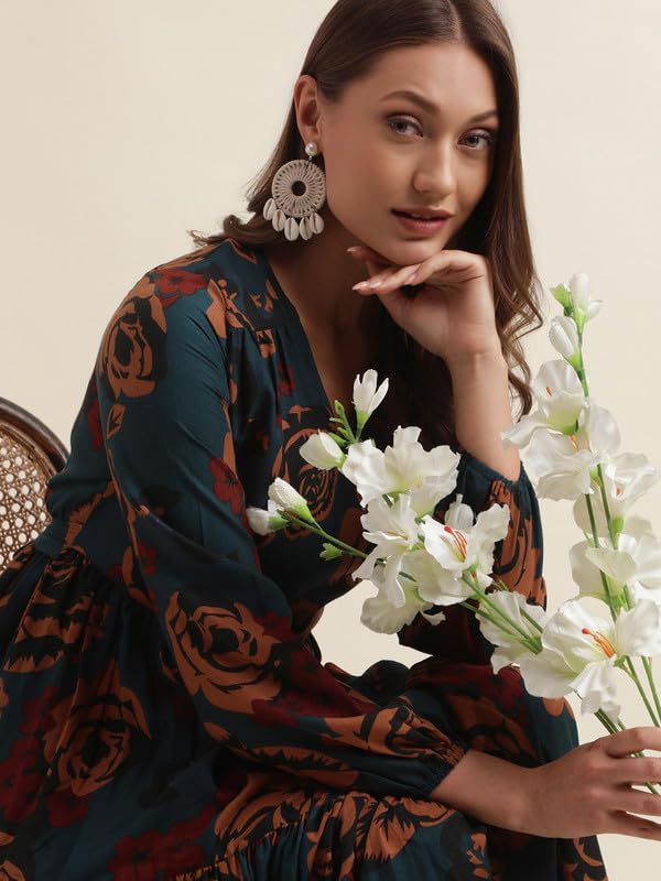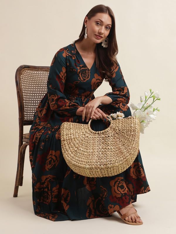 Step into effortless charm with the SIRIL Women’s Blue Printed Western Maxi Dress, designed for women who want both comfort and style. This dress is crafted from lightweight poly rayon, known for its soft feel and easy drape—so you feel relaxed all day long.